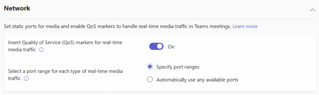 Login di https://admin.teams.micorosft.com sebagai Teams Administrator atau sebagai Global Administrator. Lalu pilih menu di panel sebelah kiri Meeting -> Meeting settings. Dan di bawah Network, pastikan Insert Quality of Service (QoS) markers for real-time media traffic dalam kondisi On, dan di bagian Select a port range for each type of real-time media traffic yang terpilih adalah button radio Specify port ranges seperti berikut: