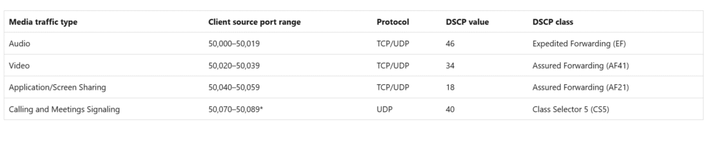 Name : teamsaudio Owner : PowerShell / WMI NetworkProfile : All Precedence : 127 AppPathName : C:\program files\windowsapps\msteams_25275.2601.4002.2815_x64__8wekyb3d8bbwe\ms-teams.exe JobObject : IPProtocol : UDP IPSrcPortStart : 50000 IPSrcPortEnd : 50019 IPDstPortStart : 3478 IPDstPortEnd : 3481 DSCPValue : 46 Name : teamsvideo Owner : PowerShell / WMI NetworkProfile : All Precedence : 127 AppPathName : C:\program files\windowsapps\msteams_25275.2601.4002.2815_x64__8wekyb3d8bbwe\ms-teams.exe JobObject : IPProtocol : UDP IPSrcPortStart : 50020 IPSrcPortEnd : 50039 IPDstPortStart : 3478 IPDstPortEnd : 3481 DSCPValue : 34 Name : teamsappsharing Owner : PowerShell / WMI NetworkProfile : All Precedence : 127 AppPathName : C:\program files\windowsapps\msteams_25275.2601.4002.2815_x64__8wekyb3d8bbwe\ms-teams.exe JobObject : IPProtocol : UDP IPSrcPortStart : 50040 IPSrcPortEnd : 50059 IPDstPortStart : 3478 IPDstPortEnd : 3481 DSCPValue : 18 Name : teamscallingmeetings Owner : PowerShell / WMI NetworkProfile : All Precedence : 127 AppPathName : C:\program files\windowsapps\msteams_25275.2601.4002.2815_x64__8wekyb3d8bbwe\ms-teams.exe JobObject : IPProtocol : UDP IPSrcPortStart : 50070 IPSrcPortEnd : 50089 IPDstPortStart : 3478 IPDstPortEnd : 3481 DSCPValue : 40